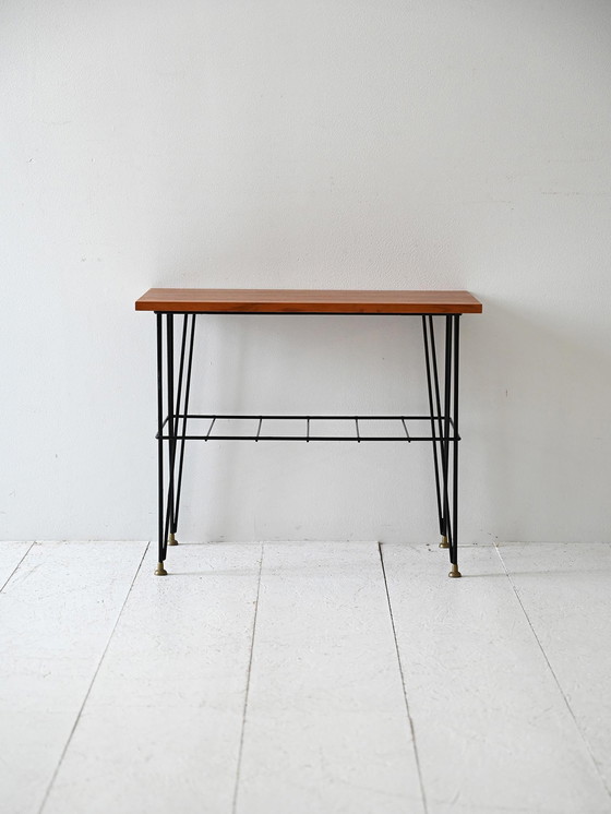 Nachtkastje uit 1950/60 met houten blad, zwart metalen frame en open opbergplank.
