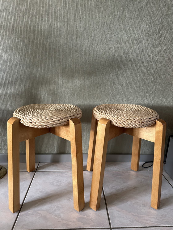 Mooie set vintage Scandinavische rush krukjes. Gemaakt van hout (grenen) met een gevlochten touw zitting. In de stijl van Audoux en Minnet. Jaren 70. Nette vintage staat met normale gebruikssporen.