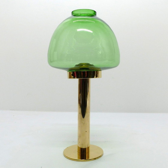 Scandinavische lantaarnkandelaar in verguld messing en doorschijnend chartreuse groen glaswerk van Hans-Agne Jakobsson voor Markaryd. Deze kandelaar is voorzien van een ingenieus veersysteem dat in de voet is verborgen voor de kaars. Goede staat, zeer goede staat van het glaswerk. Etiket. Circa: 1960 Zweden Hoogte: 35 cm / 13.8 In. Diameter glaswerk : 18 cm. Gewicht : 0.9 KG REF : NTR7011224