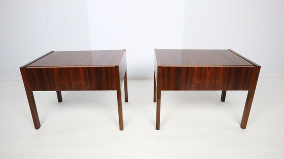 Paar Illum Wikkelsø nachtkastjes 1960. Structuur en poten in gelakt palissander. Lade vooraan.