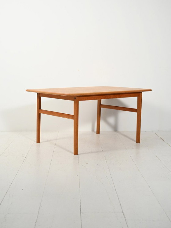 Elegante Scandinavische eikenhouten salontafel uit de jaren 1950-1960, gekenmerkt door een ingetogen en evenwichtig ontwerp, typisch voor Scandinavisch meubilair uit het midden van de vorige eeuw. De tafel heeft een rechthoekig blad met zacht afgeronde randen, een detail dat de geometrie verzacht en de kwaliteit van het houtwerk benadrukt. Het gefineerde blad toont een verfijnde constructie, waarbij de richting van de houtnerf een subtiele contrasterende textuur over het oppervlak creëert. Strakke lijnen, een lichte structuur en evenwichtige proporties geven het meubelstuk een eenvoudige maar verfijnde uitstraling, die de naoorlogse Scandinavische designfilosofie weerspiegelt, gebaseerd op functionaliteit, natuurlijke materialen en zorgvuldig vakmanschap. In goede staat. Kan gebruikssporen vertonen. Bekijk de foto's aandachtig.