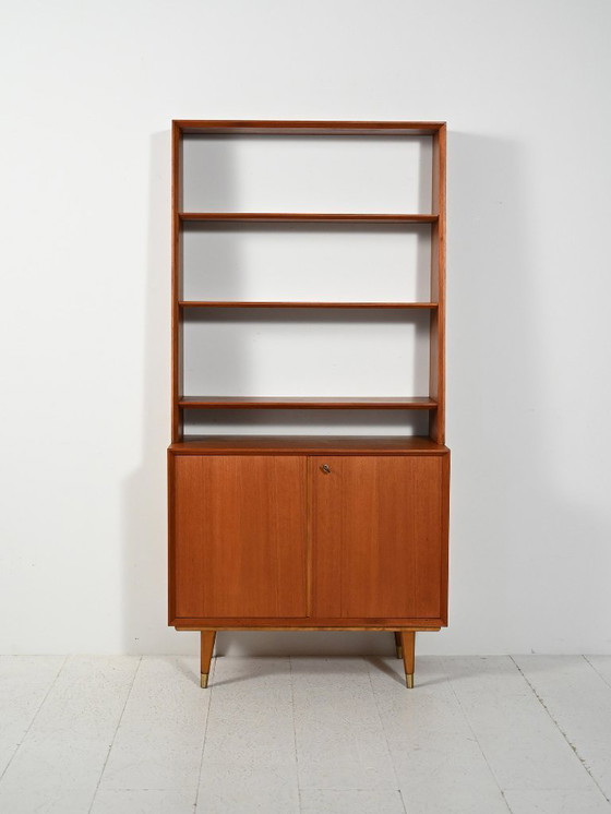 Scandinavische teakhouten boekenkast uit de jaren 1950-1960 met onderkast en poten met messing dopjes.