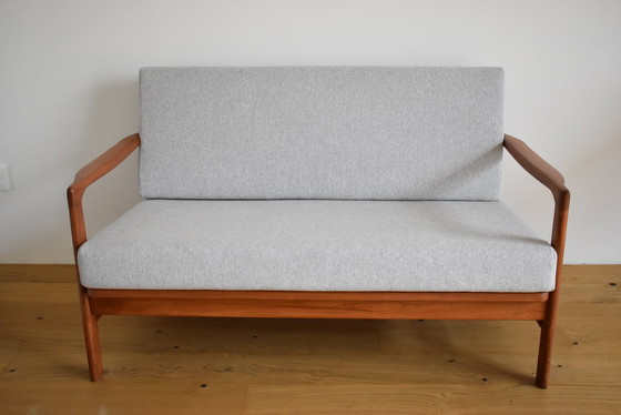 De tweezitsbank is ontworpen en vervaardigd op basis van een zeer populaire fauteuil uit de jaren 1960 - ook verkrijgbaar in onze selency shop. Hierdoor kunnen we genieten van het comfort van 60 jaar geleden in een nieuwe versie. De stijl doet erg denken aan Scandinavische fauteuils, wat waarschijnlijk heeft bijgedragen aan het grote succes. Het hout is behandeld met ecologische teakhoutbeits met een satijnen afwerking. De kussens zijn gemaakt van middelhard schuim met een verhoogde weerstand tegen kneden. De gebruikte stof is zeer goed bestand tegen vuil en als het toch gebeurt, kan het worden verwijderd en gewassen met behulp van ritssluitingen. De bank is in elke productiefase met de hand gemaakt.