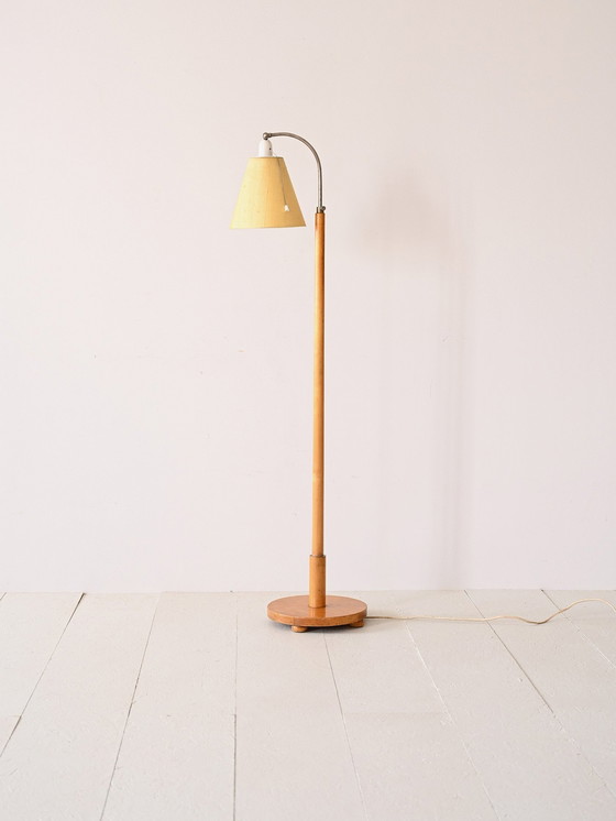 Elegante Scandinavische vloerlamp uit de late jaren 1950, met een bruyèrehouten voet en steel met een warme, natuurlijke tint. De gebogen metalen arm ondersteunt een pastelgele stoffen kap die een zacht, omhullend licht verspreidt. Een verfijnd stuk, perfect voor het creëren van een gezellige sfeer in elke omgeving.