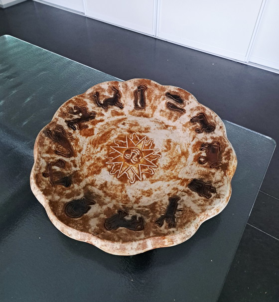 Xl steengoed 'Zodiac' schaal of middenstuk. Geproduceerd door Studio Poterie Chaleroi Armogres. In perfecte staat. Ca 1950.