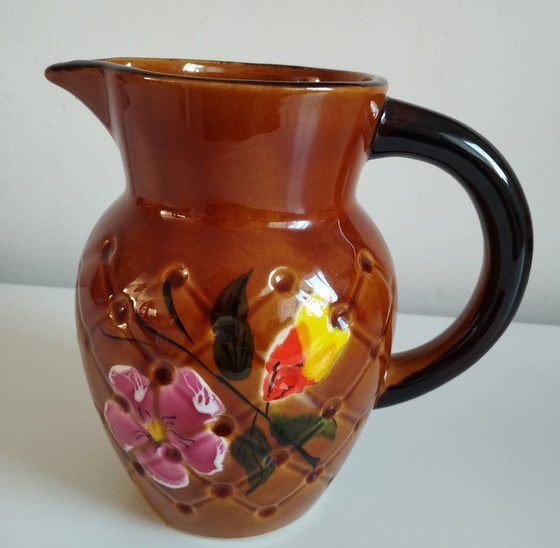 Deze Printanier Resille/Poët-Laval kruik/karaf is versierd met typische Poët-Laval visnetmotieven uit de jaren 60. Authentiek.
