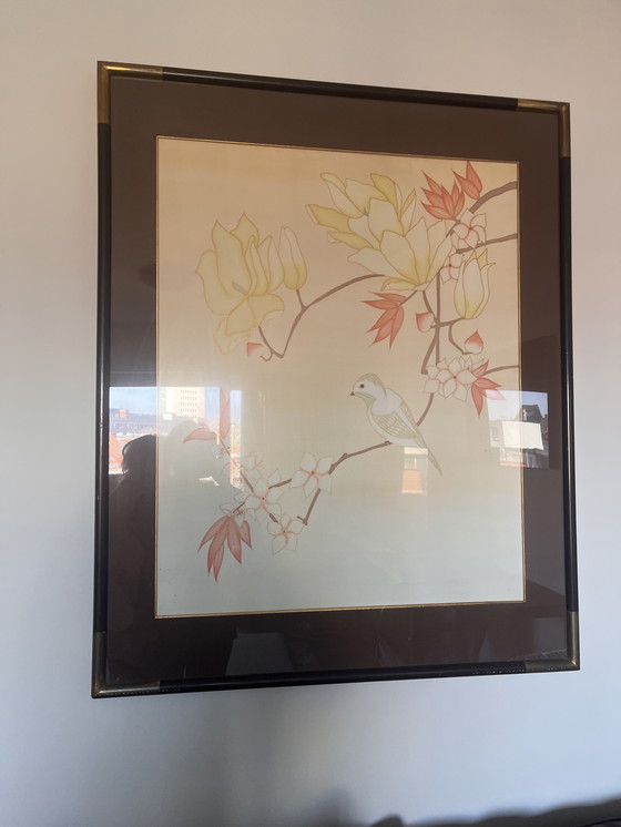 Dit elegante schilderij toont een sierlijk vogeltje dat op een tak zit, versierd met levendige bloemen. De zachte tinten rood, geel en wit creëren een serene en harmonieuze compositie, perfect om een vleugje rust aan elke kamer toe te voegen. Ingelijst in hout en beschermd door glas, is dit kunstwerk een prachtig voorbeeld van Aziatisch geïnspireerde kunst.