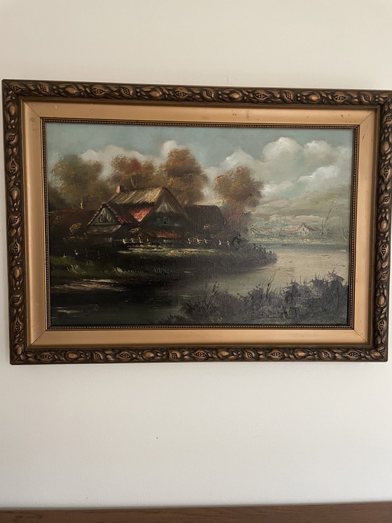 Schilderij Van Boerderij Aan Het Water Met Warme Kleuren En Mooie Originele Lijst