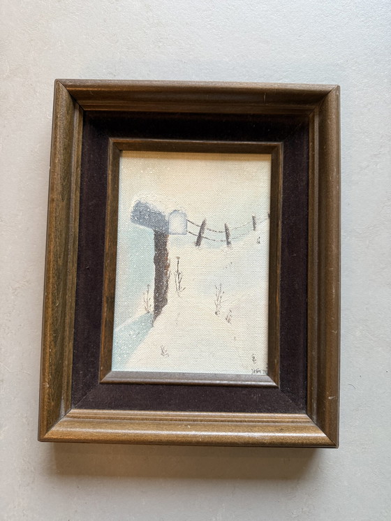 Prachtig schilderij Rustgevende voorstelling van een brievenbus in de sneeuw Gesigneerd door de kunstenaar Gemaakt in 1979 Lijst hout met fluweel. Afmeting inclusief lijst 26x21 cm Afmeting doek 17x12 cm