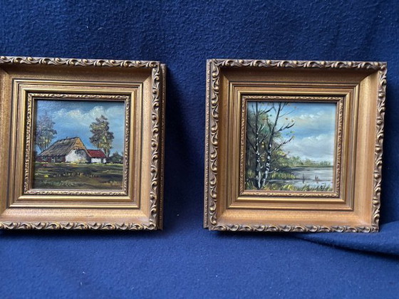 Werk van kunstschilder R. van Geel. Alle drie de schilderijen zijn gesigneerd. Afmetingen: 2 kleine schilderijen van 21,5x21,5 - paneel 12,5x12,5. Groot schilderij van 43,5x37,5 - linnendoek 30x24,5. Allen geschilderd met olieverf.