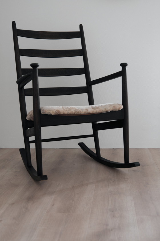 Prachtige vintage schommelstoel met originele bekleding. Ontworpen door Poul M. Volther voor Gemla in Zweden. Deze schommelstoel is gemaakt van donkerbruin gebeitst hardhout met originele stoffen bekleding. In uitmuntende vintage staat!