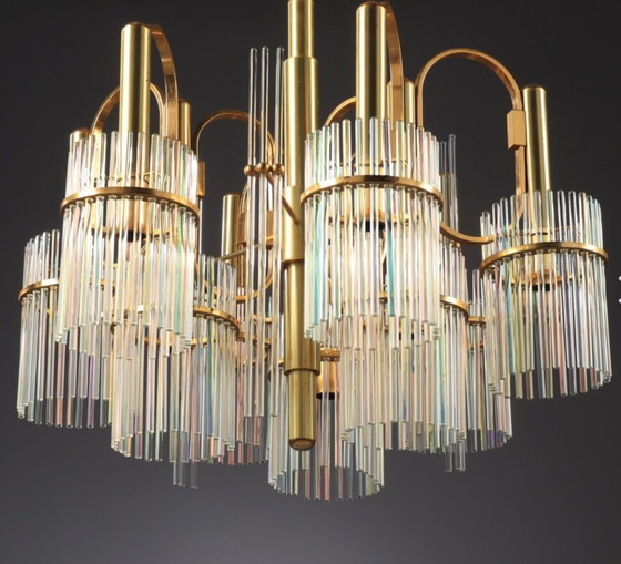 Dit is een prachtige kroonluchter van Sciolari, met een prachtige combinatie van goudkleurig metaal en transparante glazen staven. Het mid-century moderne ontwerp voegt een vleugje elegantie en verfijning toe aan elke ruimte. De kroonluchter is in uitstekende staat, met slechts kleine krassen op de metalen onderdelen, wat typisch is voor vintage items. Perfect voor wie op zoek is naar een klassiek en stijlvol verlichtingsstuk voor in huis.