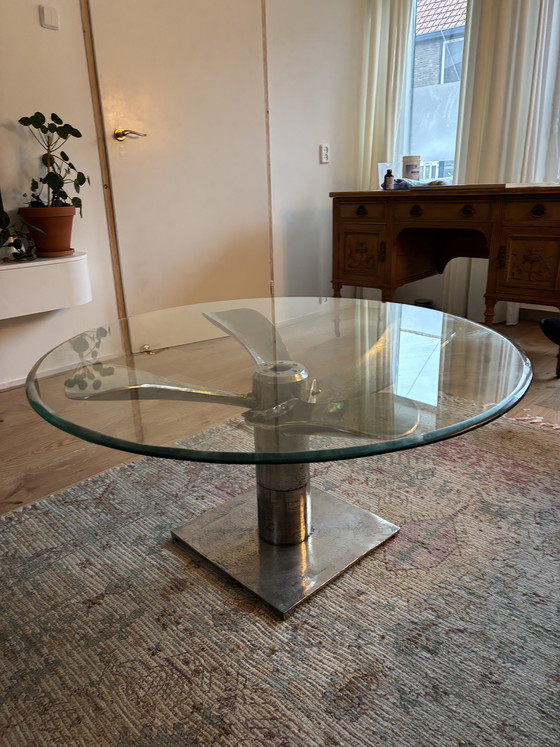Sculpturale salontafel met glazen blad en metalen propellervoet