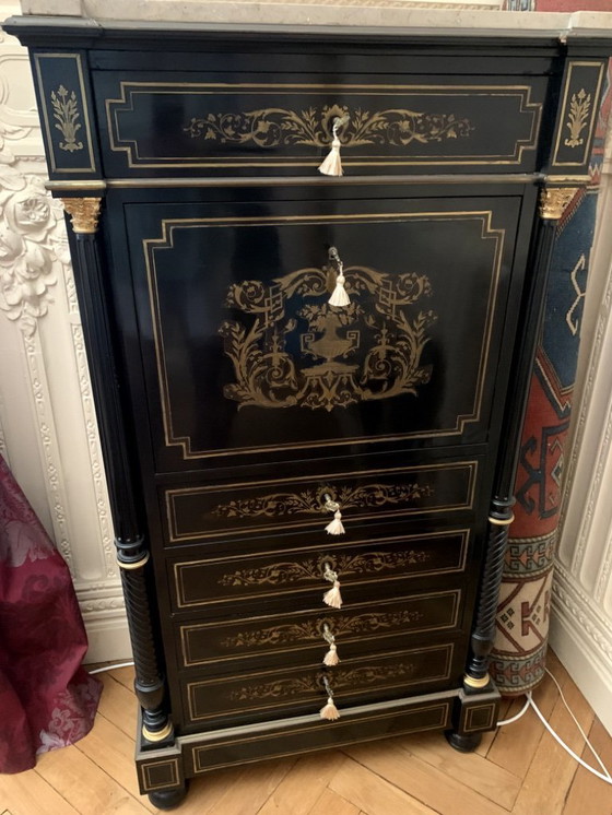 Expert certificaat beschikbaar, de rechter gevel wordt geflankeerd door twee vrijstaande gecanneleerde en gedraaide zuilen. Het oppervlak van de klep is versierd met een cassolettemotief binnengegaan door twee vlinders, bronzen lijstwerk, schrijftafel in vogeloog esdoorn onderstreept door citroenfilet, originele sloten, etc. Bestand en andere foto's op aanvraag.
