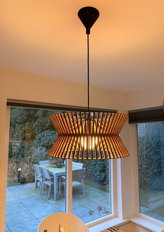 - Het unieke ontwerp met houten lamellen zorgt voor een sfeervolle lichtverspreiding, ideaal voor eetkamers of woonkamers.