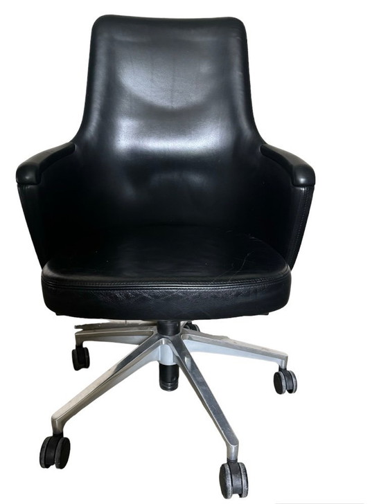 Directeurs-bureaustoel van het kwaliteitsmerk Sedus, model Silent Rush. Uitgevoerd in zwart kwaliteitsleer en met chromen stervoet met wielen.