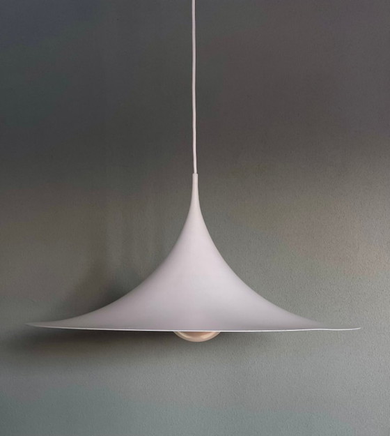 Iconische Semi 60 hanglamp, ontworpen in 1969 door Claus Bonderup en Torsten Thorup voor Fog & Mørup. Dit is de IKEA-editie uit de jaren 90 (model T Typ9001), geproduceerd onder licentie, met dezelfde vorm, hetzelfde silhouet en dezelfde diameter van 60 cm.