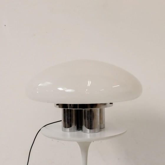Zeldzame ‘Magnolia’ tafellamp van Sergio Mazza & Giuliana Gramigna voor Quattrifolio Design. Het Italiaanse ontwerp stamt uit 1973. Dit is de (zeer) grote versie van de lamp. Op de verchroomd metalen voet rust een mushroom opaalglas kap. Een uiterst decoratieve en zeldzame tafellamp met een hoog Italiaans Space Age Design gehalte.