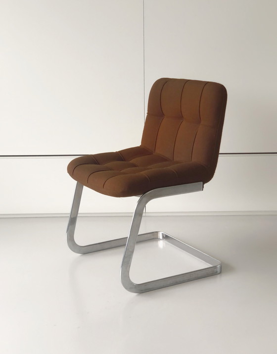 Serie van 6 "Storm" stoelen van Yves Christin voor Airborne. Circa 70. Label van de uitgever. Originele chocoladekleurige wollen stof. Verchroomde metalen poten.
