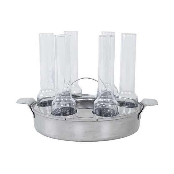 Een set van zes glazen in een elegante metalen standaard met handvatten. De slanke, cilindrische glazen vormen een moderne vintage-stijl set, perfect voor het serveren van drankjes of als een bijzonder decoratief object.