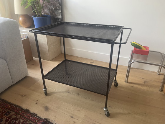 Stap terug in de elegantie van de jaren 1950 met deze serveerwagen van de bekende ontwerper Mathieu Matégot. Dit Mid Century Modern meubel is een perfecte mix van functionaliteit en stijl, met een slank donkerbruin metalen frame en geperforeerde planken die een vleugje verfijning toevoegen aan elke ruimte.