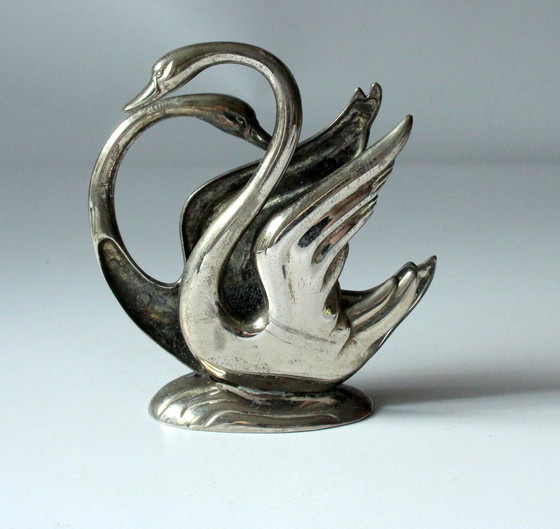 Romantische oude verzilverde servethouder in de vorm van een zwanenpaar. In goede vintage staat met typische ouderdomsaanslag - zie foto's. Mid Century servet- en brievenhouder Frankrijk metaal verzilverd. Prachtig als brievenhouder en tafelmiddenstuk - en een geweldig huwelijkscadeau met symbolisch karakter.