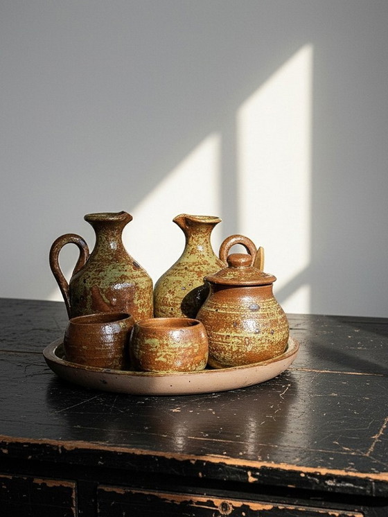 Service à condiments vintage grès pyrité émaillé artisanal style Baudat La Borne