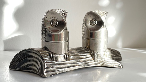 Origineel en zeldzaam M.H. SALT & PEPPER Service in VINTAGE zilvermetaal, een paar gestileerde uilen op een tak met jaren 70 design, gemaakt in het Verenigd Koninkrijk, een echt chique en decoratief object!