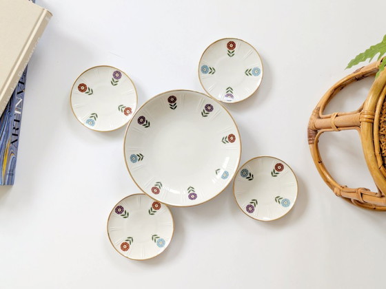 Een charmante porseleinen set uit het midden van de vorige eeuw van Winterling Röslau Bavaria, gemaakt in de jaren 1960. Het bestaat uit 4 kleine onderzetters of schotels en 1 koekjesschotel, elk versierd met een typisch jaren 60 bloemmotief in levendige tinten blauw, rood, paars en groen, afgewerkt met een verfijnde gouden rand. Aan de onderkant gemerkt.
