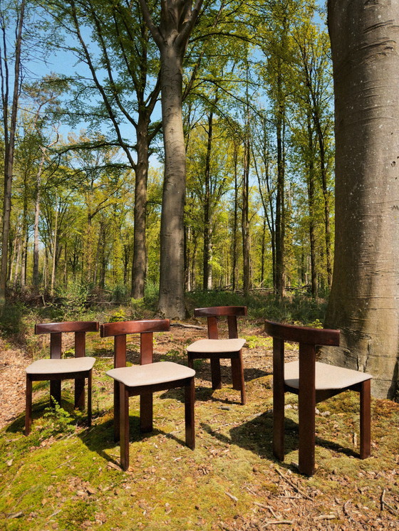 Deze vintage stoel, gecreëerd door Luigi Vaghi, belichaamt verfijnde eenvoud en het hoogtepunt van vakmanschap. Uit tropisch hardhout gesneden, ademt het acajou gewaxt oppervlak een diepe warmte die verhalen lijkt te fluisteren van verre plaatsen en hedendaagse aesthetics. Het T-vormige rugontwerp dat doorloopt in de achterpoten als het gewei van een antilope, volgt de menselijke contouren in een gebogen leuning.