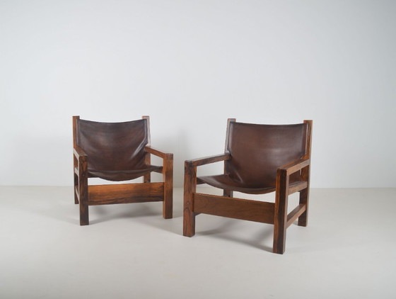Set zetels uit Frankrijk vervaardigd in de jaren '70. Deze zetels hebben een frame in prachtig olijfhout met een zitting van bruin tuigleer.