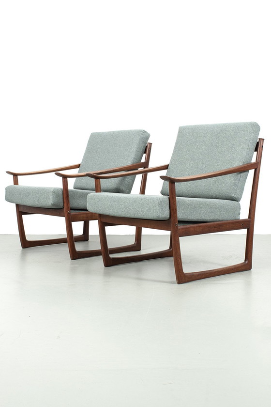 Set Hvidt FD130 fauteuils ontworpen door Peter Hvidt & Orla Molgaard Nielsen voor France & Daverkosen. Prachtige jaren 60 Deens design stoelen in teak uitvoering. De kussens zijn nieuw en met wol bekleed.In een goede vintage staat.