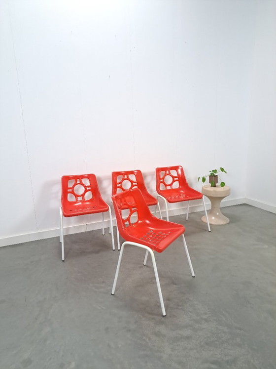 Vintage rode kunststoffen stoelen uit de jaren 70. De kuipstoelen komen uit de DDR tijd in Oost Duitsland. De stoelen hebben een wit metalen onderstel en rode kunststoffen zittingen. De vier stoelen zijn leuk te gebruiken als eetkamerstoelen of als tuinstoelen.