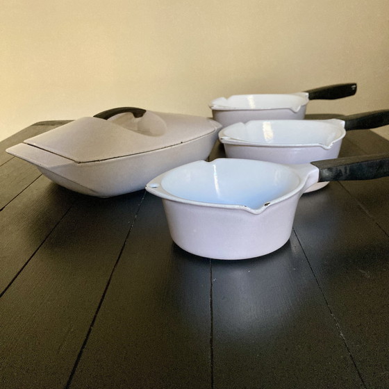 Dit is een vintage set Le Creuset pannen ontworpen door Raymond Loewy. De set bestaat uit meerdere stukken, elk gemaakt met de hoogwaardige emaille coating waar Le Creuset bekend om staat. Het ontwerp is zowel functioneel als stijlvol, waardoor het een geweldige aanvulling is op elke keuken. Ondanks enkele tekenen van slijtage (zie foto), zijn deze pannen duurzaam en blijven ze goed presteren in kooktoepassingen.