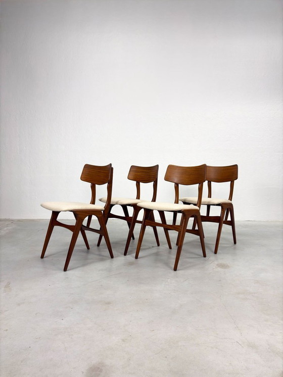 Prachtige set van vier vintage eetkamerstoelen van Topform, geproduceerd in de jaren ’60. Omdat Louis van Teeffelen naar verluidt destijds ook voor Topform ontwierp, zou dit ontwerp zomaar van zijn hand kunnen zijn, al ontbreekt daarvoor bewijs.