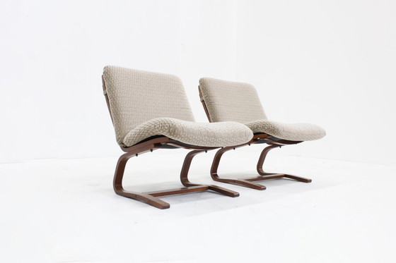 Set Mid century easy chairs from the 1960s. Beautiful fabric and wooden frame. Both in good condition, with small traces of use on the wooden frame consitent with age. Some small scratches. Comfortable seating
