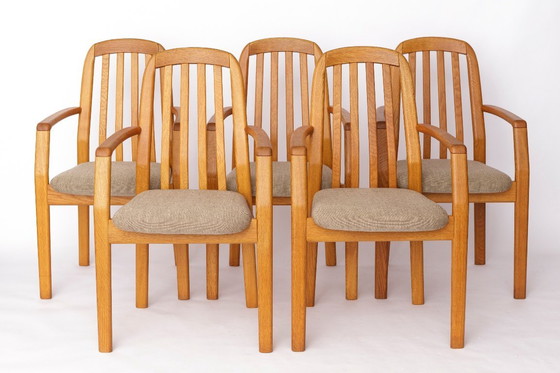 Set of 5 Dyrlund Oak Armchairs, Danish Mid Century Dining Chairs 1970s, Solid Oak Vintage Armchairs