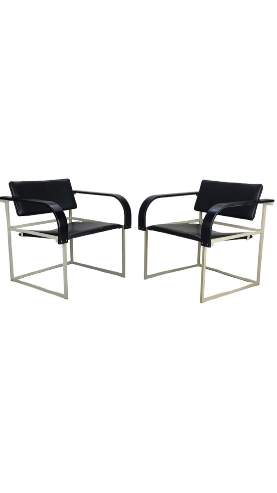 Set van 2 postmoderne fauteuils van Pierre Maizairac en Karel Boonzaaijer voor Pastoe uit de jaren 80. Zeldzaam in de fauteuil variant. Bekleed met zwart leer