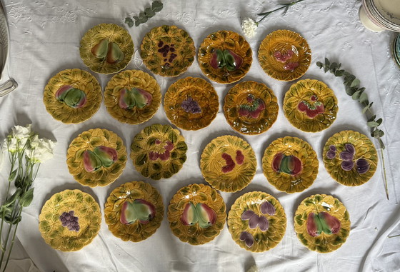 Set van 19 Sarreguemines aardewerken borden met een fruitmotief 📏 Afmetingen: Diameter: 20 cm ⚖️ Totaal gewicht: 4,5 kg 📌 In zeer goede algemene staat