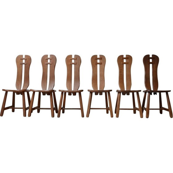 Set van 12 Brutalistische eikenhouten eetkamerstoelen uit de Mid Century van De Puydt, België 1970