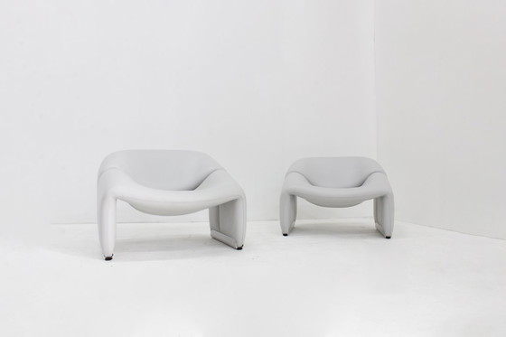 Set van 2 Artifort Groovy fauteuils model F598, ontworpen door Pierre Paulin voor Artifort. Een iconische stoel, zeer comfortabel. Deze set van 2 Groovy stoelen zijn opnieuw bekleed met prachtig grijs leer.