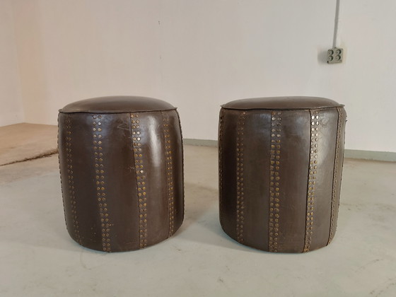 Set van 2 vintage leren poefs/voetbanken, bruin leer met metalen pinnen.