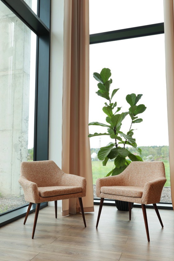 Paar klassieke clubfauteuils uit de jaren 1960 na volledige renovatie. Emmervormige fauteuils op houten poten die lijken op wortels, typisch voor Midcentury meubilair. De poten van de fauteuils zijn aan de onderkant smaller, wat de fauteuils lichter maakt.