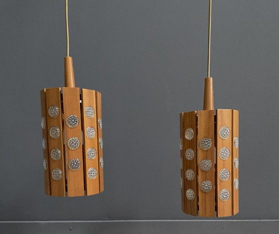 Set van 2 houten hanglampen uit de jaren 70 met plastic ogen
