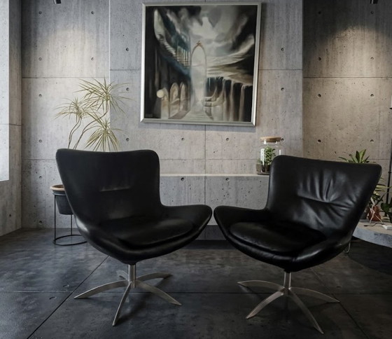 Ben je op zoek naar een combinatie van Scandinavisch design en hoogwaardig comfort? Deze prachtige set van twee zwarte lederen fauteuils van het gerenommeerde Deense merk Hjort Knudsen is een aanwinst voor elk interieur. Dankzij de slanke stervormige voet en het organische ontwerp passen ze perfect in zowel een modern, industrieel als vintage interieur.