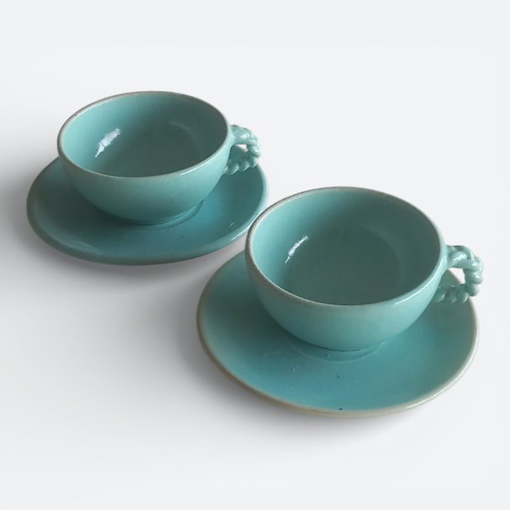 Ambachtelijk vervaardigde kop-en-schotel sets in steengoed, uitgevoerd in een zacht turquoise glazuur met subtiele spikkelstructuur. De stukken tonen duidelijke draaisporen en een handgevormd oor met gevlochten modellering. De natuurlijke variaties in vorm, glazuur en afwerking wijzen op atelierproductie.