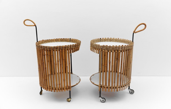 Set van 2 Mid-Century Modern ronde serveerwagens van bamboe, jaren 60,