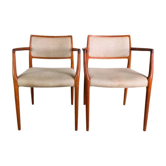 We bieden twee zeldzame teakhouten fauteuils van de traditionele Deense fabrikant JL Møller Møbelfabrik uit de jaren 1960 te koop aan. De stoelen zijn ontworpen door Niels Otto Moller en staan bekend onder de modelnaam "Model 80". Ze zijn nog steeds erg populair en wereldwijd gewild.