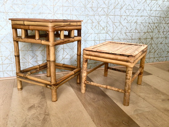 Omarm de tijdloze elegantie van mid-century design met deze prachtige set van twee rotan bijzettafels. Deze meubels stralen een natuurlijke charme uit en zijn perfect om een vleugje warmte en verfijning toe te voegen aan elke woonruimte.