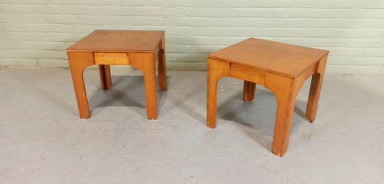 Set van 2 houten bijzettafeltjes of nachtkastjes met vintage design. Wat krassen, verkleuring en kleine beschadigingen op het fineer, zie foto's.